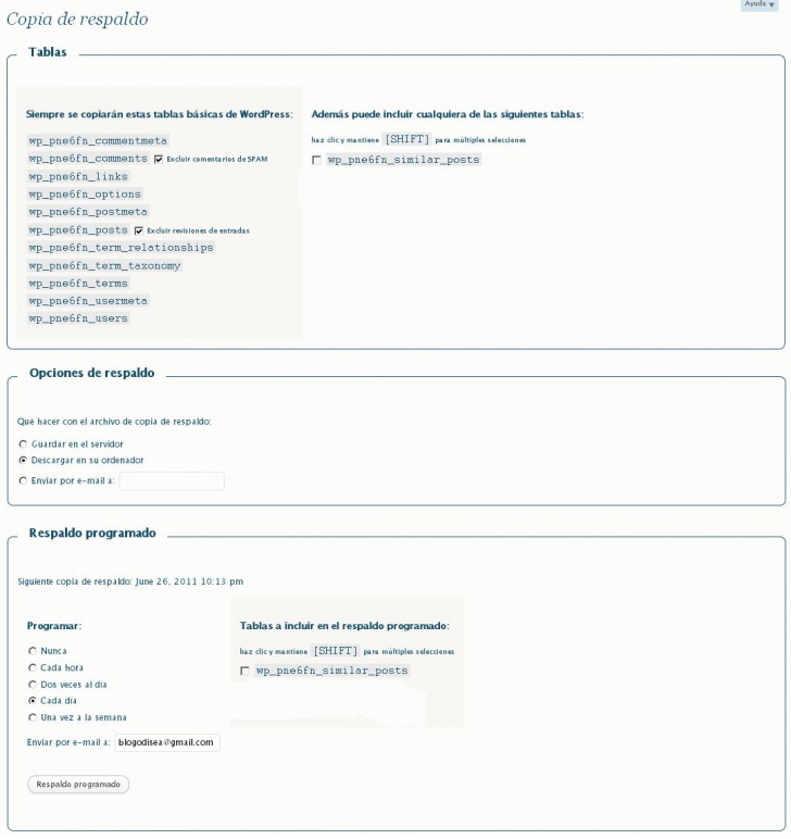 Lo de guardarlo en las carpetas de instalación de WordPress no es muy aconsejable, ya que si sufres un problema con el servidor, lo mejor es disponer de la copia en algún lugar externo al blog. Guardar la copia en el ordenador es también poco cómodo, ya que requiere una acción manual y lo que buscamos es comodidad. La mejor opción sería enviarla por correo de manera diaria, de esa manera nos despreocuparíamos de controlar esta tarea, y la copia estaría alojada externamente fuera del servidor.
