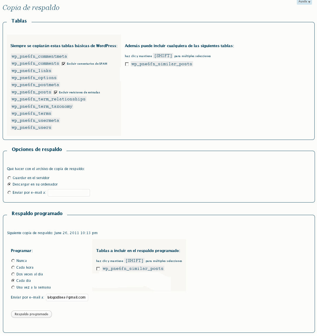 El mejor plugin que empleé yo era WordPress Database Backup, que puede descargarse aquí. Te permite guardar la copia en las carpetas de instalación de WordPress, bajarlo a tu ordenador o enviarlo por e-mail.
