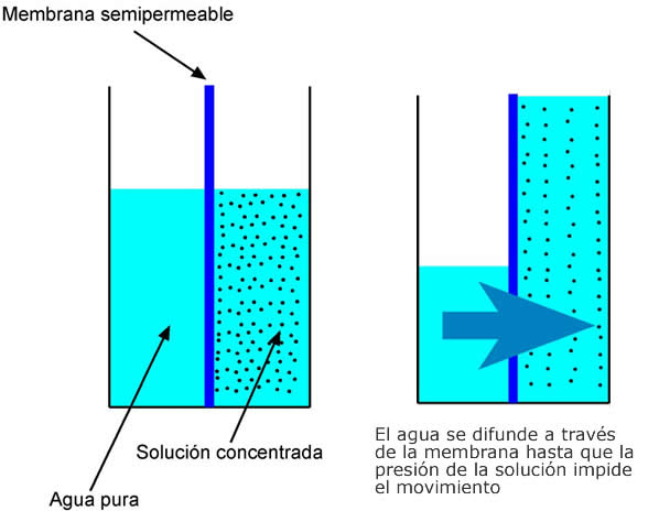 Ósmosis – Si dos soluciones son separadas por una membrana, el agua (pero no las moléculas en solución) puede moverse a través de la membrana, cambiando la concentración de la solución de ambos lados. Esto recibe el nombre de ósmosis. Cuando la piel presenta un aspecto arrugado después de estar en la bañera demasiado tiempo, es porque el agua ha fluido dentro de nuestras células por ósmosis.