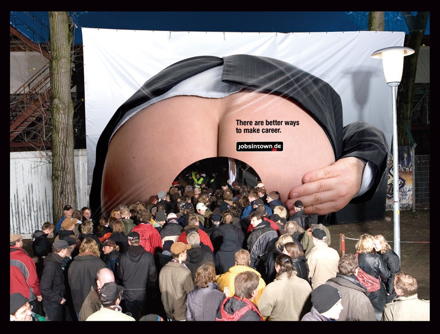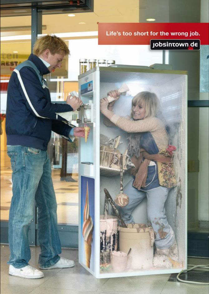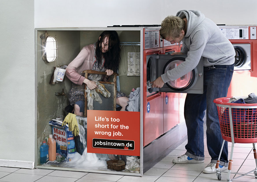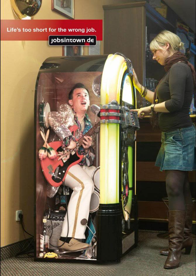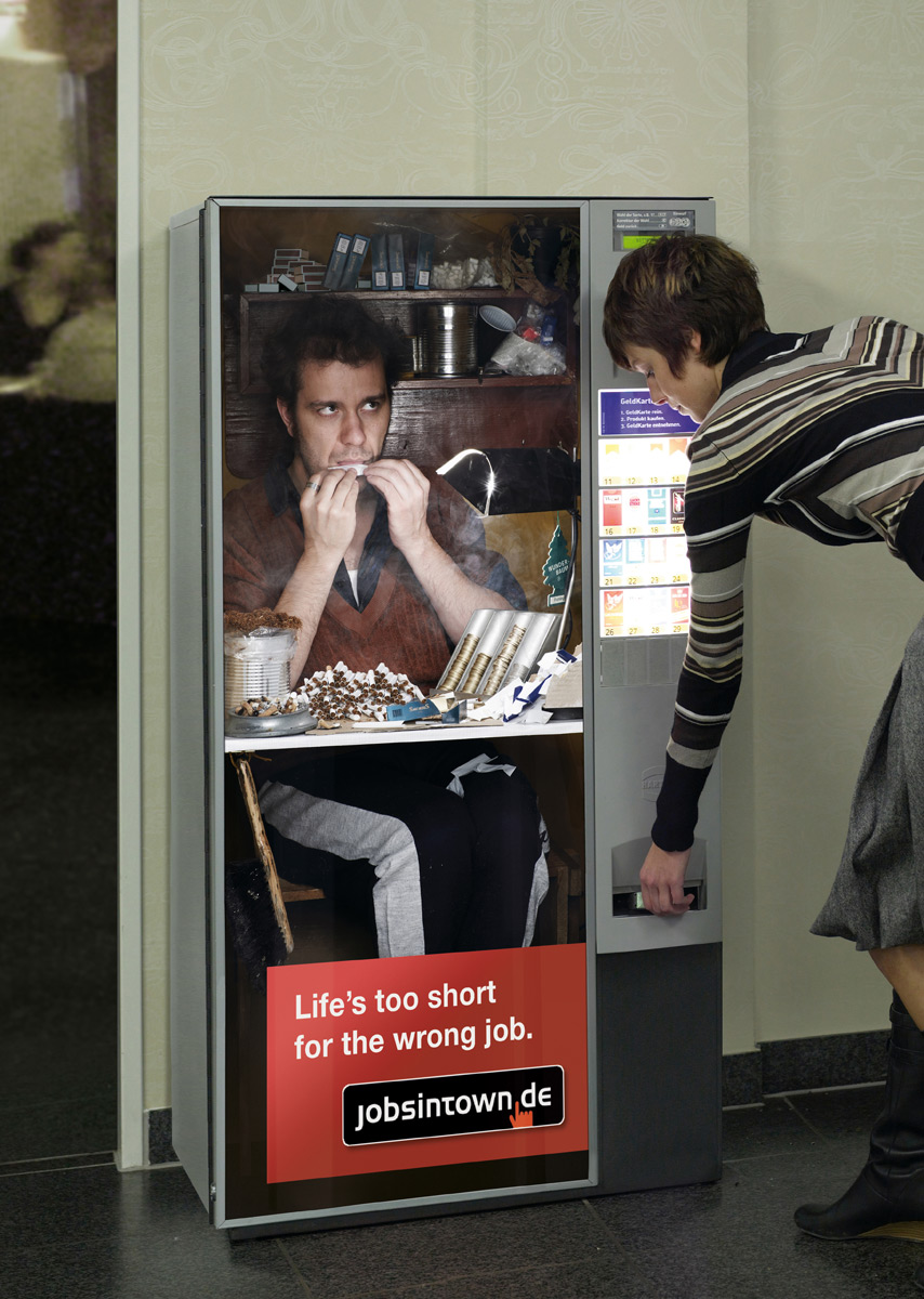Publicidad del sitio web alemán jobsintown.de, para búsqueda de trabajo. «La vida es demasiado corta para el trabajo equivocado».