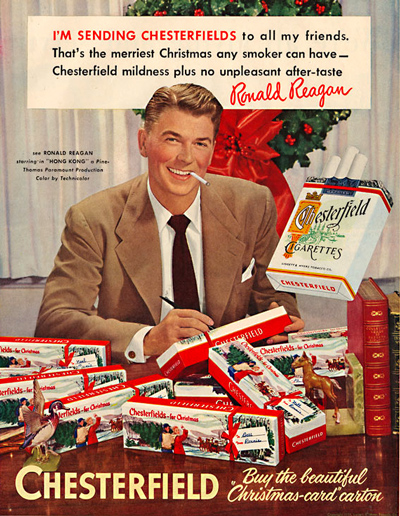 Chesterfield: Envío Chesterfield a todos mis amigos. Es la mejor Feliz Navidad que cualquier fumador podría tener. La suavidad de Chesterfield sin ese desagradable gusto tras haber fumado. Ronald Reagan.
