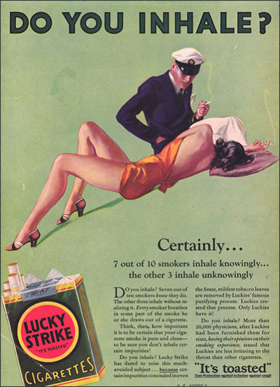 Lucky Strike: ¿Inhalas? Ciertamente… 7 de cada 10 fumadores aspiran con conocimiento de causa… los otros 3 aspiran sin saber lo que inhalan.