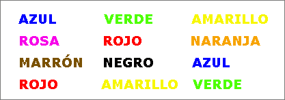 Éste sería el mismo cuadro sin incongruencias entre el color mostrado y el significado de la palabra: