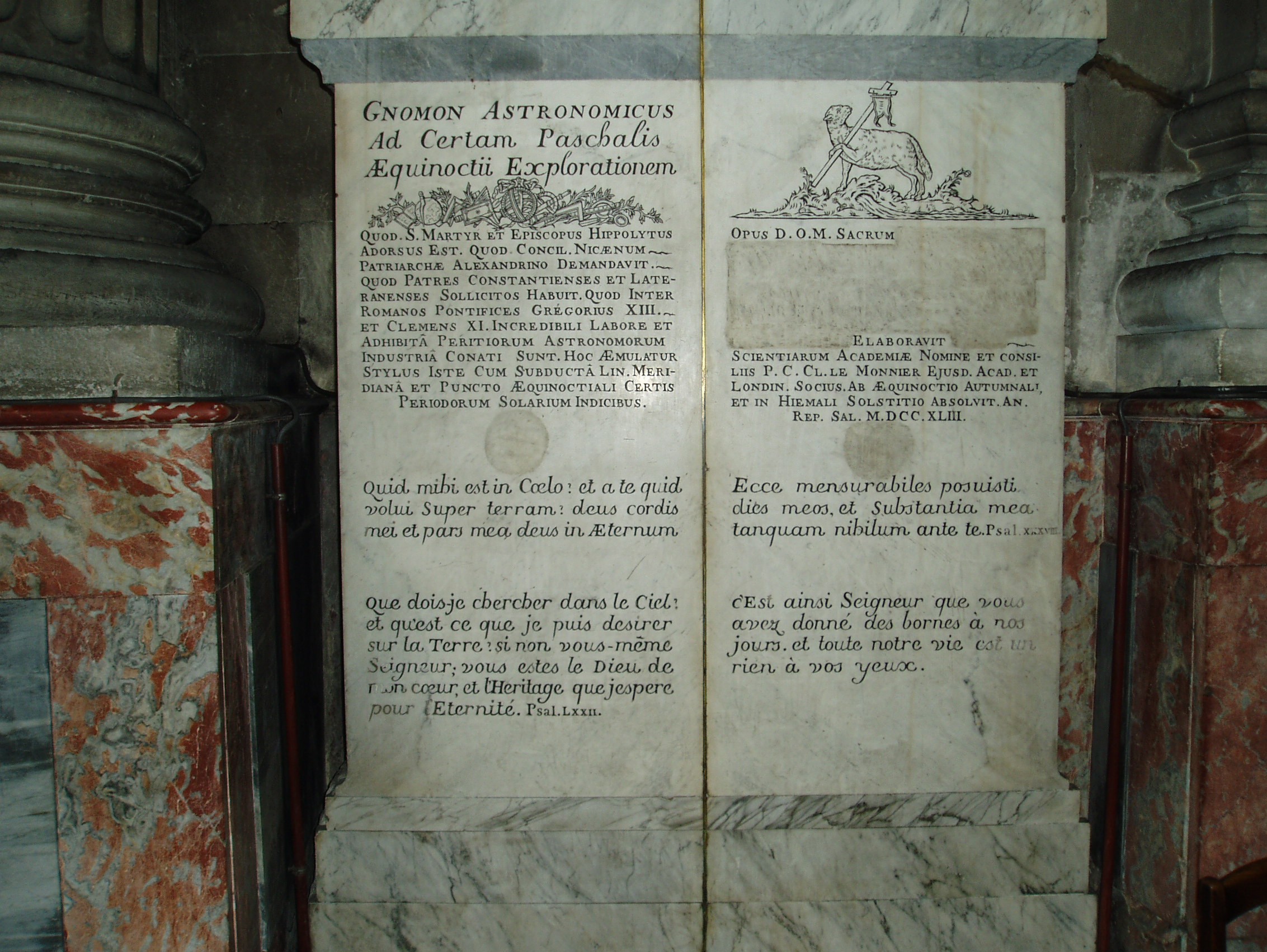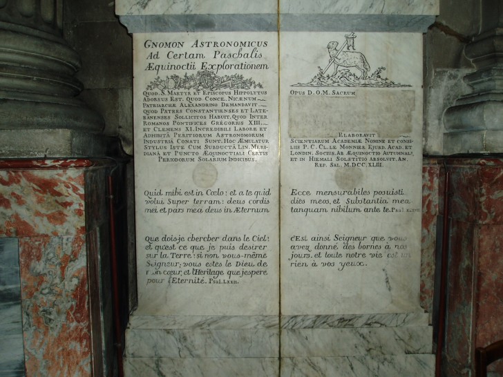 En el gnomon de la iglesia de San Sulpicio en París, hay una inscripción donde se da cuenta de las propiedades e historia de este instrumento.