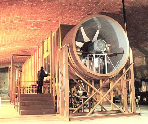 La pared ubicada frente a él está conformada por una rejilla por la que penetra el aire que manda una gran turbina colocada detrás, al tiempo que actúa como un difusor, proporcionando uniformidad a la corriente ventosa.
