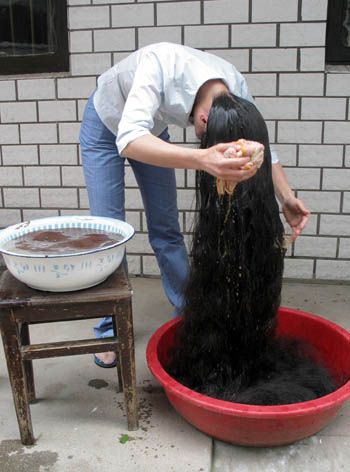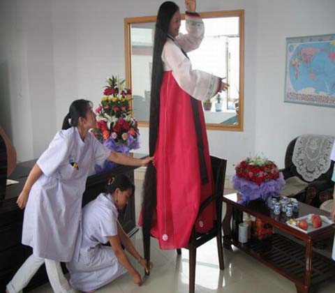 He estado buscando fotos, pero ya he llegado a un punto en que no sé si la de la foto es realmente Xie, o es otra de sus paisanas llamada Cheng Shiqun, que lleva persiguiendo el récord desde que se lo dejó crecer en 1996. Actualmente su cabello mide 2,4 metros de largo. Pues eso, que buscando fotografías de Xie, que es la que realmente posee el récord, he visto que muchas veces aparecen fotos de Cheng en su lugar. Como son tan parecidas… XD.