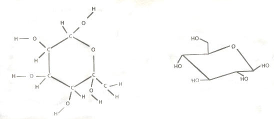 Este es el ejemplo con una molécula de glucosa, uno de los azúcares básicos. En la parte de la izquierda la tenemos con todos los átomos presentes, y en el dibujo de la derecha está dibujada con las reglas que se han expuesto anteriormente.