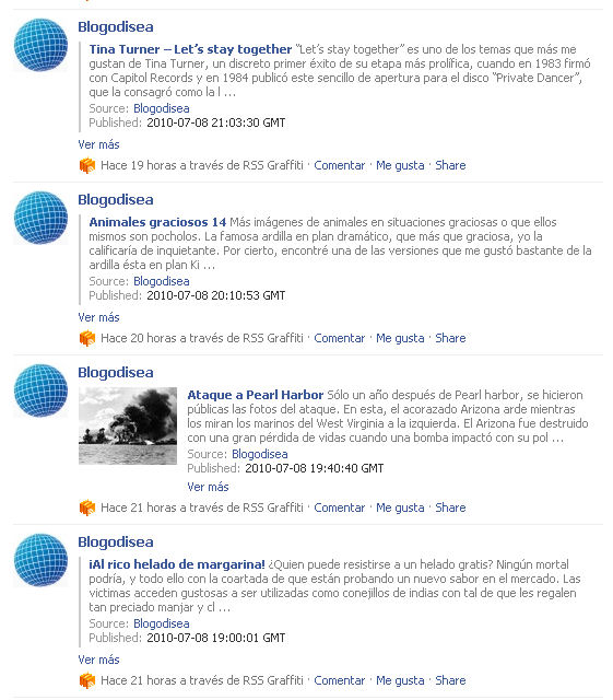 O sea, que si publicas un enlace a un mp3 como hacen los podcasters, o un vídeo, en el feed se refleja como un enlace. Al parecer, cuando la página de Facebook consultaba el feed, por alguna extraña razón no podía extraer ninguna imagen y las entradas se quedaban como en la imagen de abajo a la izquierda. Al final lo pude arreglar para que quedaran siempre como en la imagen de abajo a la derecha, con todas las entradas acompañadas de su miniatura.