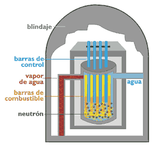 Existe una gran probabilidad de que la electricidad que disfrutamos en nuestra casa sea generada por un reactor nuclear. En los gráficos de abajo vemos cómo funciona un reactor: el uranio 235 se encuentra contenido en varillas de combustible de un diámetro tan grande como un lápiz. Los neutrones que se generan en las reacciones de fisión abandonan la varilla de combustible que es su «casa», son frenadas por el agua o líquido que se encuentra entre las varillas, e inician una reacción a fisión en otra varilla.