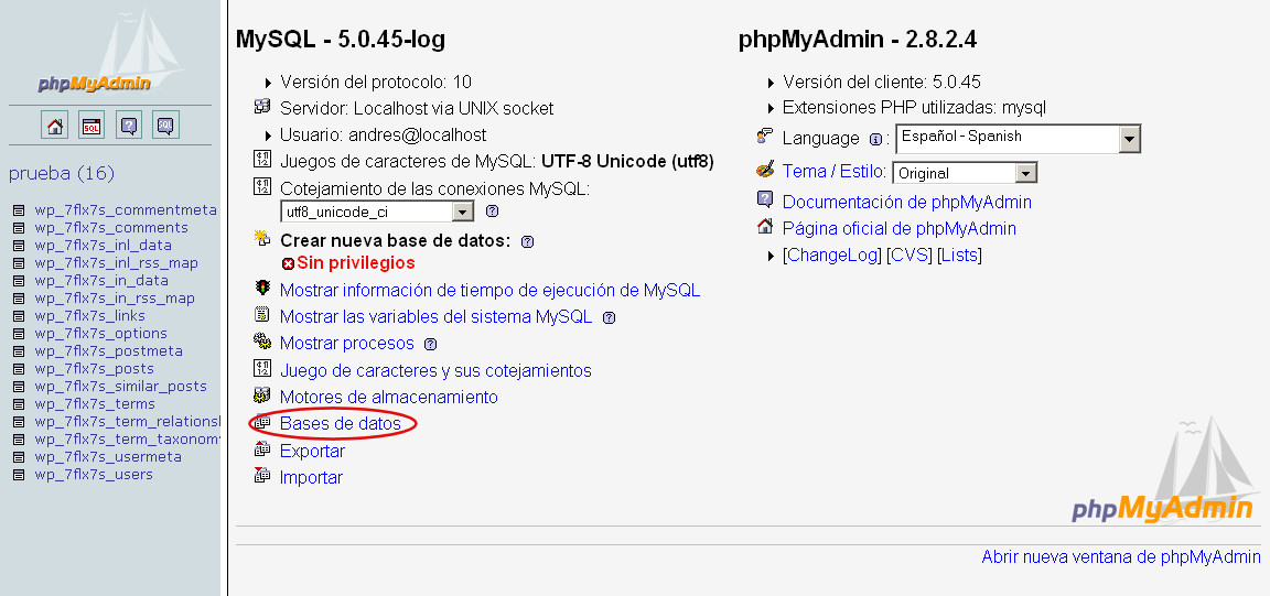Primero pinchamos en el vínculo BASES DE DATOS.