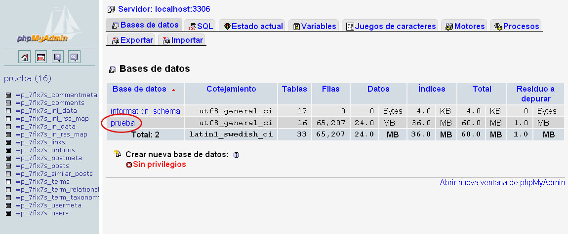 Luego escogemos la base de datos que pertenezca a nuestro blog, de la que queremos hacer la copia. En el ejemplo, se llama «prueba».