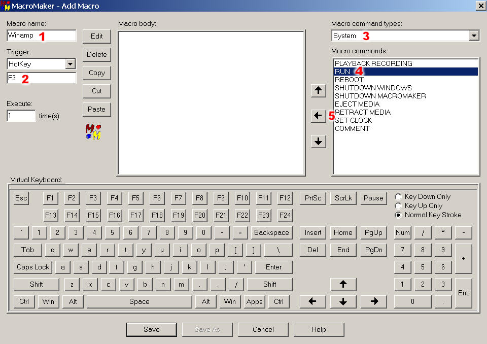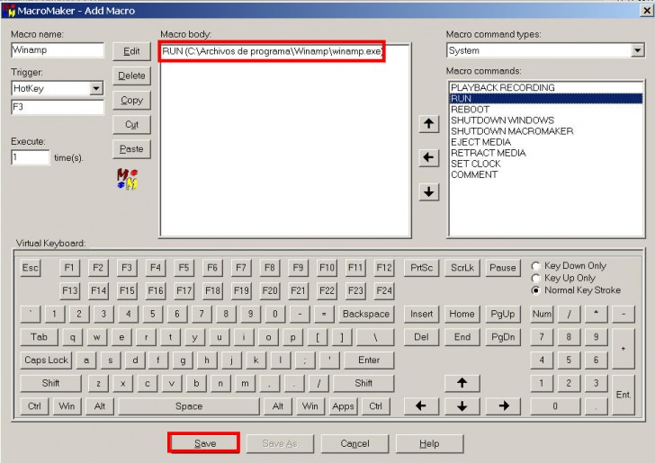 Mediante esta otra función podemos abrir ficheros o incluso programas. En el ejemplo que hay a continuación, explico cómo asociar la tecla F3 con el programa Winamp, así cuando apretemos esa tecla, el programa Winamp se abrirá. Esto mismo se puede aplicar con ficheros del ordenador. Si siempre estamos abriendo un fichero .txt, .doc, o lo que sea, podemos asignarle una tecla fija para abrir dicho fichero recurrente.
