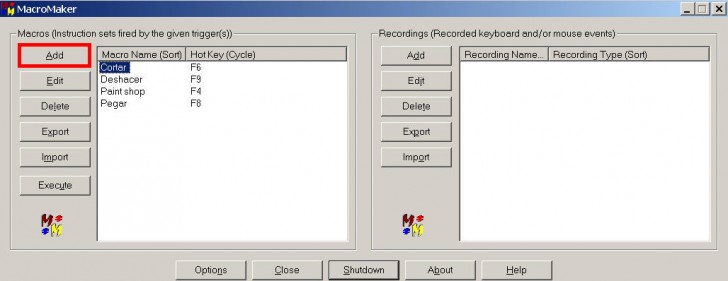 En todos los casos, la forma de hacerle aprender un nuevo macro al programa, es apretar el botón ADD.