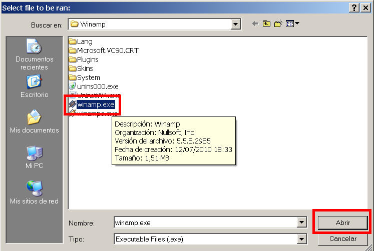 Ahora buscamos en nuestro ordenador el fichero que queramos abrir. Como lo que queremos hacer es abrir el programa Winamp, vamos a ARCHIVOS DE PROGRAMA y en la carpeta WINAMP, escogemos el fichero WINAMP.EXE, y le damos al botón ABRIR.