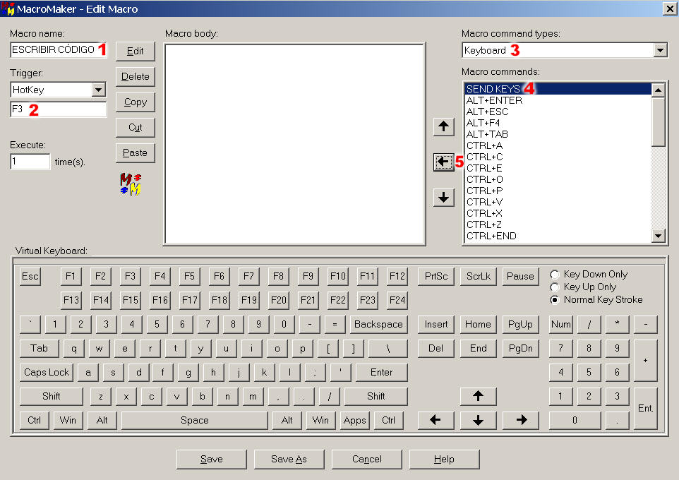 Esta función nos permitirá escribir (bueno, lo escribe el ordenador automáticamente) en cualquier programa un texto recurrente que nos sea útil, como si fuera una plantilla, tan sólo apretando una tecla. En este caso, quiero que cuando apriete la tecla F3, se escriba un texto de HTML que utilizo muchas veces. En la imagen de abajo explico los pasos por orden numérico: