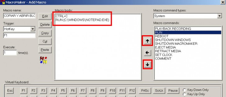 Se me olvidaba explicar que las acciones pueden ser encadenadas. En la imagen de abajo vemos que en la ventana MACRO BODY podemos ir añadiendo funciones. En este caso, queremos que cuando copiemos un texto al apretar la tecla F1, se nos abra el bloc de notas también. Después de definir los dos macros, que serían CTRL + C y RUN (C:\WINDOWS\NOTEPAD.EXE), podemos también cambiar el orden de ejecución, señalándo cada macro y empleando las teclas arriba y abajo para dejarlos en el orden requerido.