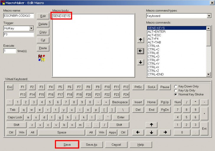 Veremos que se ha definido esta función y para terminar, apretaremos el botón SAVE. Y ya está, cada vez que apriete la tecla F3, ese texto se escribirá automáticamente.