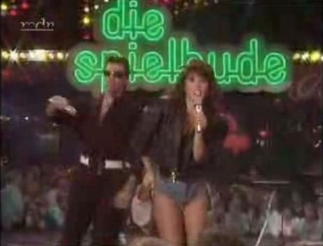 Aquí Sabrina cantando «Chica caliente» y poniendo cachondos a los tiernos púberes de media España que vivían la niñez en los 80. Atención al pantalón hipercorto y la chupa de cuero, que a todo esto, era para taparse XD.