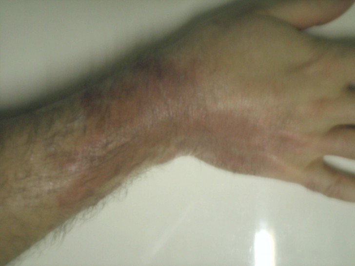 Anteayer me quemé en el trabajo; arriba podéis ver las secuelas de mi falta de atención y descuido, pues mientras preparaba una mesa con muchos platos, por las prisas del momento, me eché un caldo de pollo recién sacado del microondas por la parte de la muñeca y el antebrazo.
