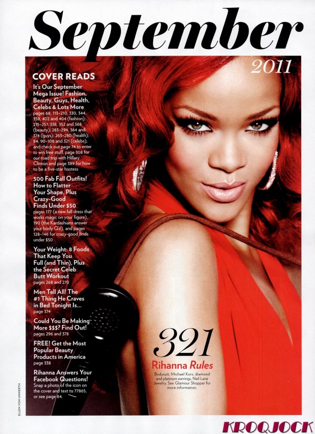 Rihanna aparece así de sugerente en la edición de septiembre de la revista Glamour, hablándonos sobre sus cosillas: el drama, la perfección, su forma de entender el estilo o sus opiniones sobre otras artistas femeninas actuales.