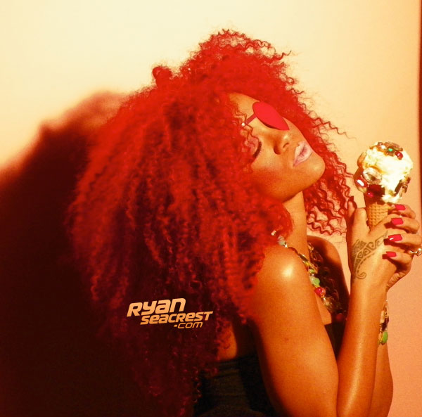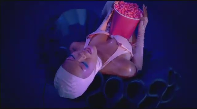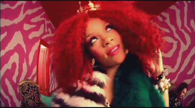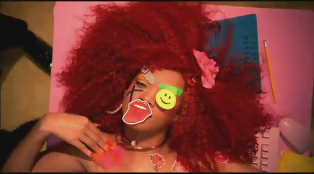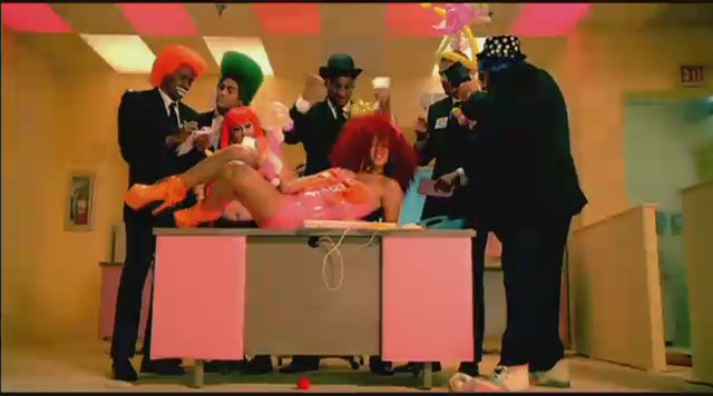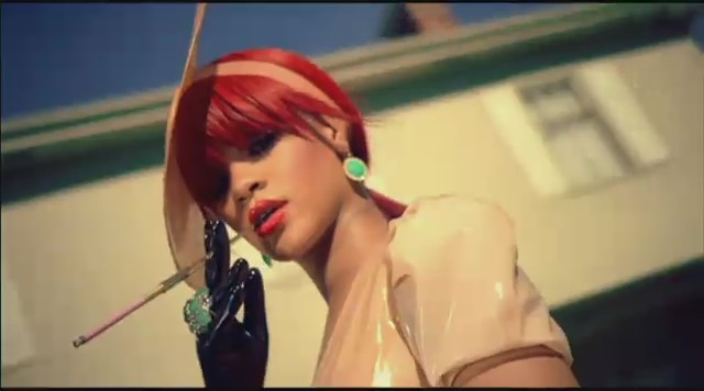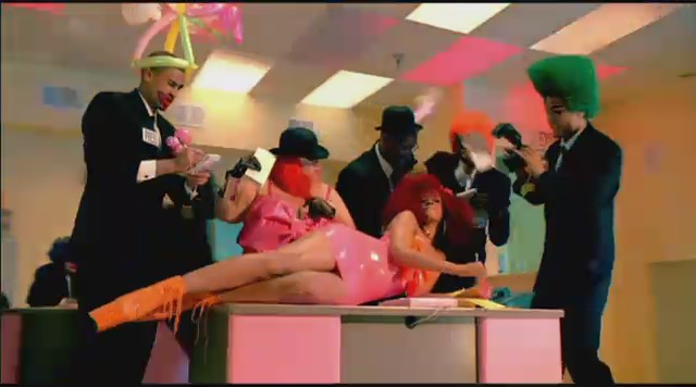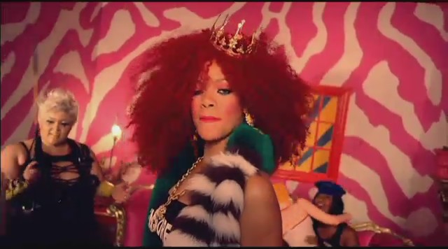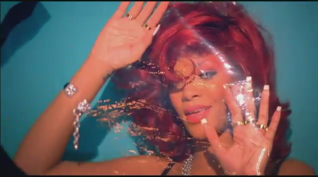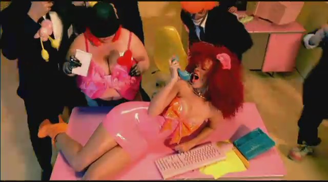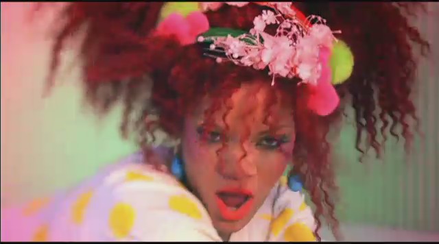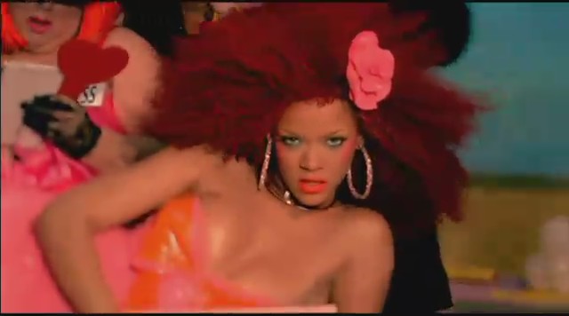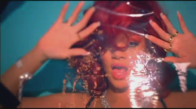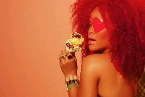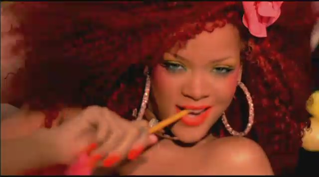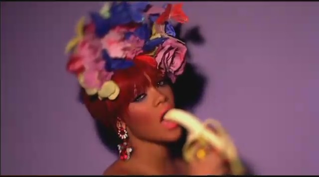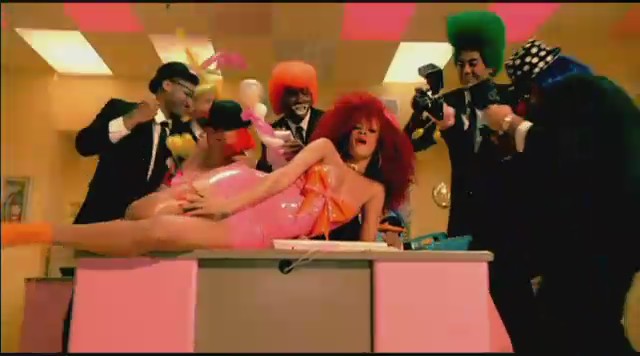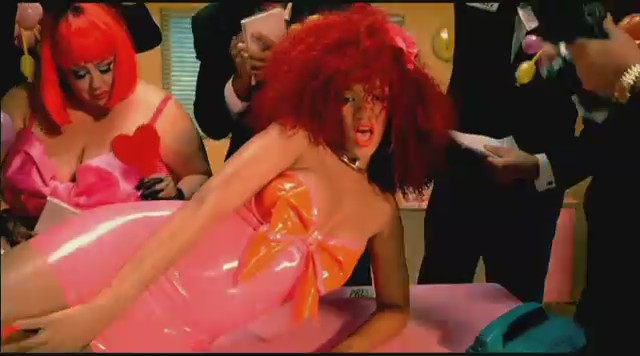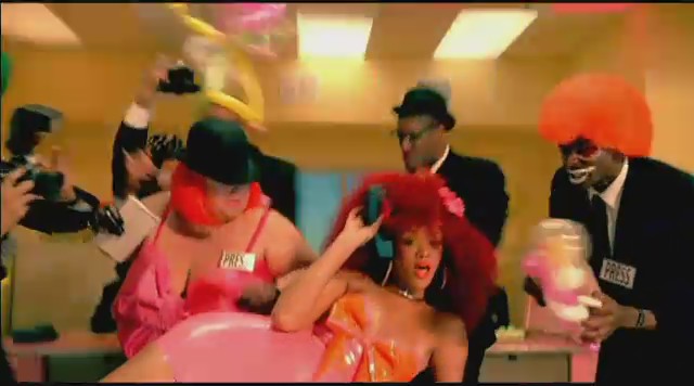 Siguiendo con las diferentes escenas, Rihanna aparece en una oficina embutida en un traje de látex rosa mientras unos reporteros vestidos de payaso le toman fotos y ella descansa encima de una mesa mientras realiza llamadas telefónicas. Más tarde aparece con un recogido en el pelo de flores mientras se come un plátano, un recogido de dos cerezas en el pelo mientras se come una fresa con nata, y termina comiéndose un helado con joyas, esta vez con el pelo suelto y un parche en el ojo en forma de corazón.