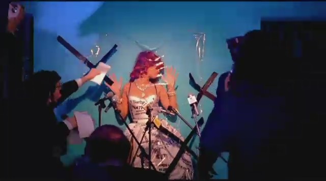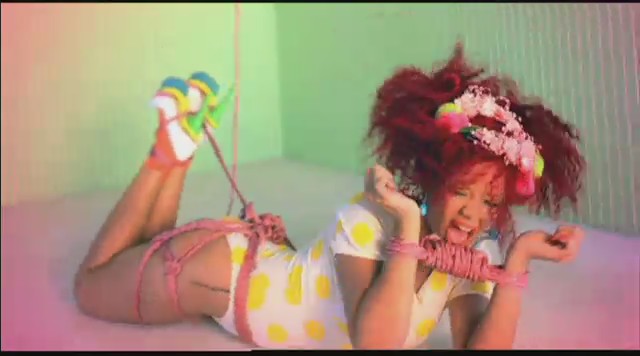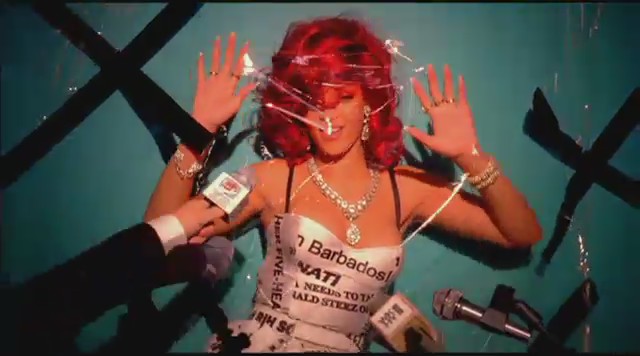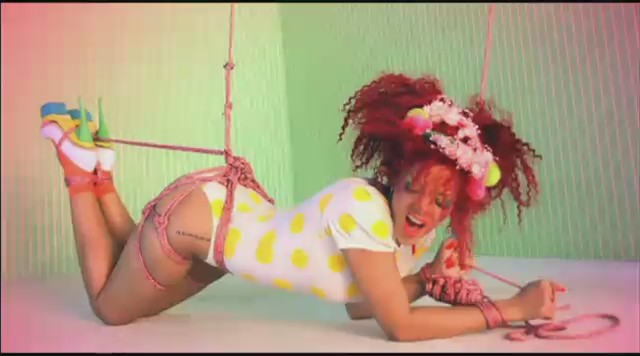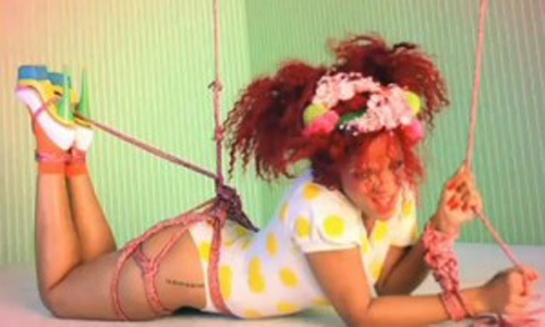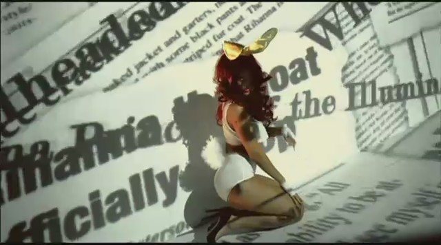 En otra secuencia vemos a Rihanna maniatada y suspendida con cuerdas en una sala colorida, al igual que sus atuendos, que semejan ser los de una lolita. También aparece vestida conejita de Playboy mientras se proyectan titulares de periódico sobre ella que hacen mención a su pelo rojizo, ser princesa de los Illuminati, rumores sobre su padre o directamente le llaman zorra que no sabe cantar.