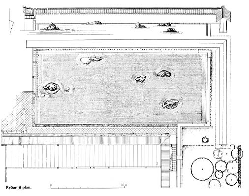 Estos jardines secos son denominados Karesansui, donde no existe la presencia de agua. Este jardín forma parte del templo que respondía a la escuela budista Rinzai-Shu Zen. La falta de árboles o vegetación, que resultan tan chocantes para los occidentales y la simplicidad del jardín, son una muestra del arte abstracto y la filosofía Zen. La filosofía Zen nunca se transmite a través de elaboradas frases, sino a través de discretas parábolas.