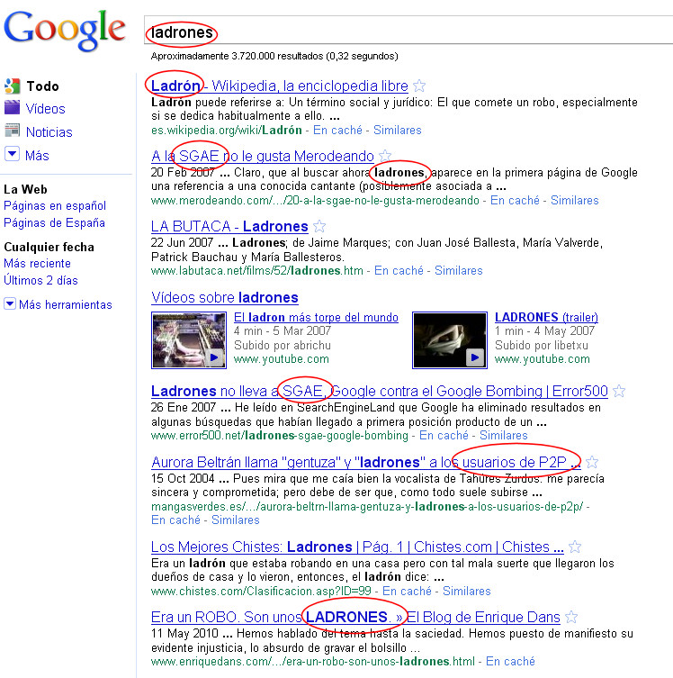 Siguiendo con el tema de la piratería, ¿os acordáis que al buscar en Google con la palabra “ladrones”, salía la SGAE en primera posición?