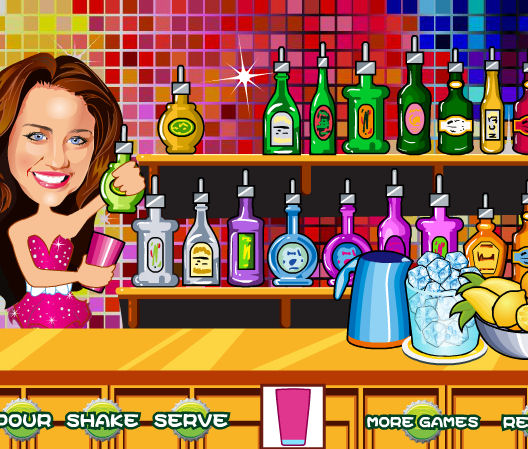 Juego de servir cocktails con la famosa Hannah Montana, o Miley Cyrus para los amigos. Tendremos que crear nuestros combinados con jugos de frutas y bebidas alcohólicas mientras lo agitamos en la coctelera antes de servirlo. Esta Hannah Montana es muy elástica, así que pincha en cualquier objeto que quieras añadir al vaso mezclador, y ella alargará el brazo y lo echará dentro si pulsas la opción POUR. Para agitar, pulsa la opción SHAKE. Para servir finalmente el cocktail, pulsa la opción SERVE.