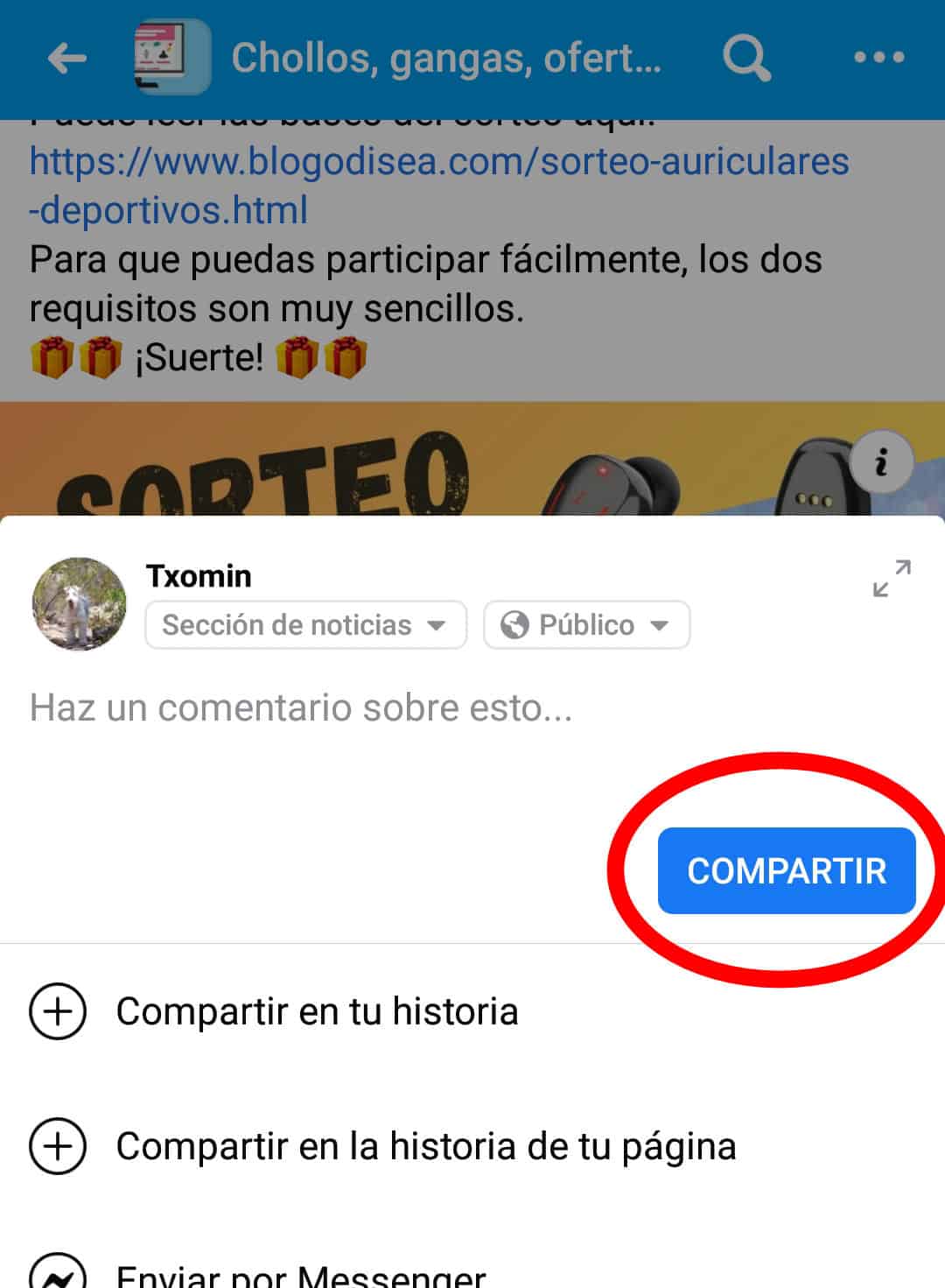 Ahora pulsa el botón de COMPARTIR el sorteo que está debajo de la foto de los auriculares.
