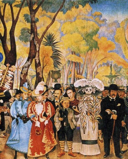 Esta es la parte central donde se plasmó a si mismo de niño junto a su esposa Frida Kahlo y la Catrina. Por cierto, la boa que trae la Catrina en el cuello es la serpiente emplumada, Quetzalcóatl, el dios de la vida para los aztecas.