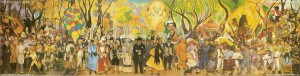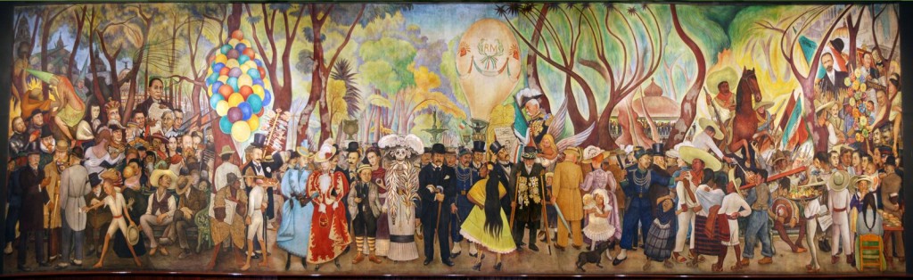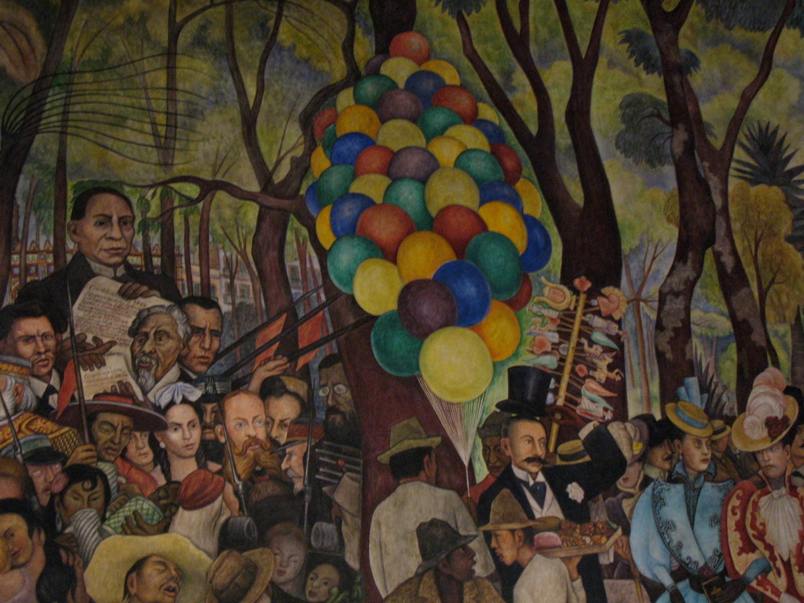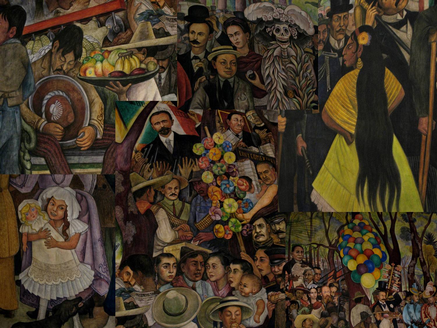 Diego se pintó a sí mismo como un niño en el mural. De esta manera recordaba sus domingos de paseo en una ciudad que comenzaba a crecer y a cambiar. Plasmó escenas de la historia de México, incluyó personajes que ya no existían, pintó con muchos colores y no dejó casi nada sin colorear. Este mural es como una gran película que habla de la historia de la ciudad y también de los dulces y los juguetes, de todo lo que uno puede hacer y contemplar en un domingo cualquiera.