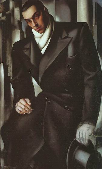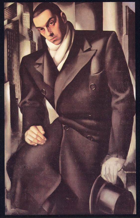 O el “Retrato de un hombre con gabán”, primer marido de Tamara, Tadeusz Lempicki, hombre dolorido que mira con seriedad, con un abrigo negro, sombreo de copa en la mano y un foulard blanco al cuello, y que protestaba durante los primeros años de vida común en París, sabiéndose traicionado por las continuas infidelidades de su mujer, que lo ponía en evidencia pintando a sus amantes. El retrato está inacabado.
