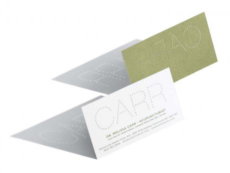 La tarjeta de una acupunturista, llena de agujeros y puntos por supuesto. Esperemos que trate mejor a los clientes que a la tarjeta.