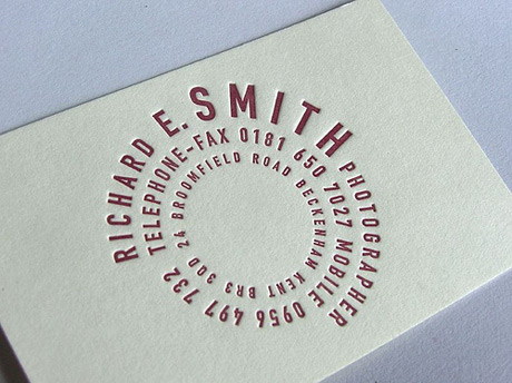Tarjeta de fotógrafo con las letras formando espirales. ¿Quizás formando un objetivo de una cámara fotográfica?