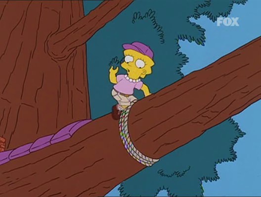 Para este primer momento, me ha venido a la memoria el episodio 4 de la temporada 12, titulado “Lisa la ecologista” (“Lisa y su amor por los árboles”), donde Lisa se hace activista dentro de un grupo ecologista, y se enamora perdidamente del guapo líder del gremio, Jesse Grass. Jesse la convence para que custodie una vieja secuoya que va a ser derribada, y Lisa abandona su casa para establecerse en las ramas del árbol y evitar que lo talen.