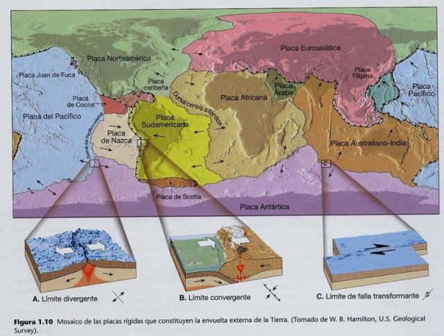 La litosfera se fracciona en siete grandes placas: Pacífica, Euroasiática, Norteamericana, Sudamericana, Africana, Indoaustraliana y Antártica, aparte de numerosas microplacas, como la del Caribe, Filipina, Iraniana, etc.