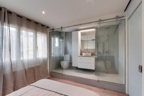 Para la distribución de la casa, ahora se prefieren los ambientes más abiertos y sin barreras, con el fin de darle más versatilidad a los espacios. Por ello, el baño va ganando su sitio y se integra en el dormitorio. La forma de hacerlo es emplear revestimientos iguales para el suelo y la pared, como se puede lograr por ejemplo con microcemento. Otra opción es emplear cabeceros para separar el dormitorio de las áreas húmedas, pero sin terminar de cerrar el espacio totalmente.
