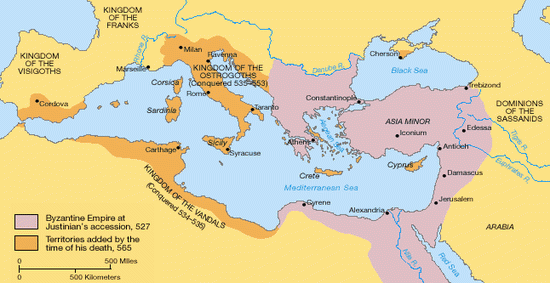 El imperio de Justiniano I. En morado marca los dominios en el momento en que Justiniano subió al trono. En naranja los territorios que conquistó durante su mandato.