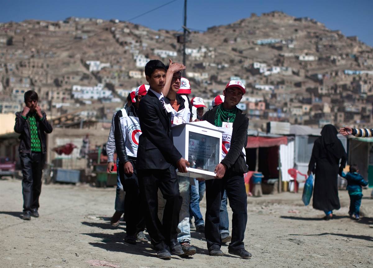 Voluntarios de la Sociedad Afgana Creciente Rojo, transportan una urna de donaciones por las calles de Kabul el 20 de marzo para las víctimas del terremoto y tsunami en Japón del 11 de marzo de 2011.