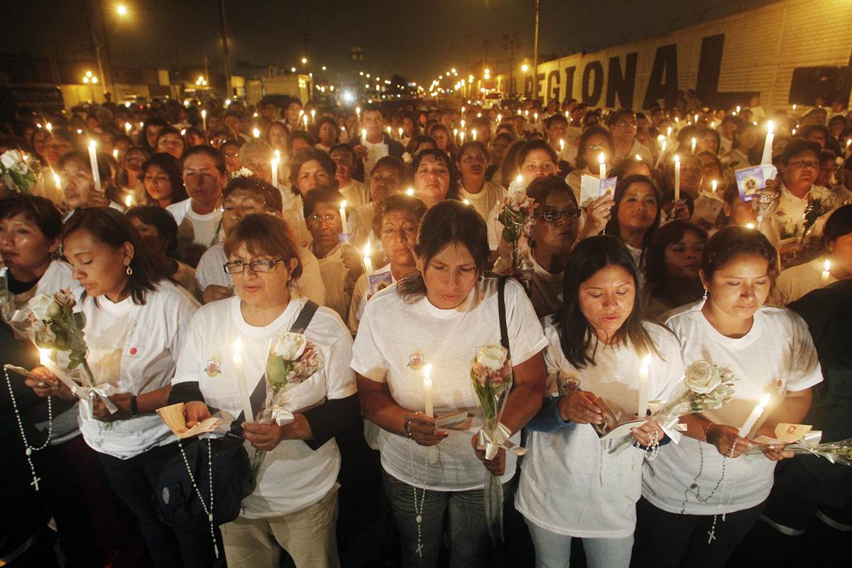 Varias personas sostienen velas mientras rezan por las víctimas del terremoto y el tsunami durante una ceremonia en la Avenida Japón, en Lima, Perú, el 17 de marzo.