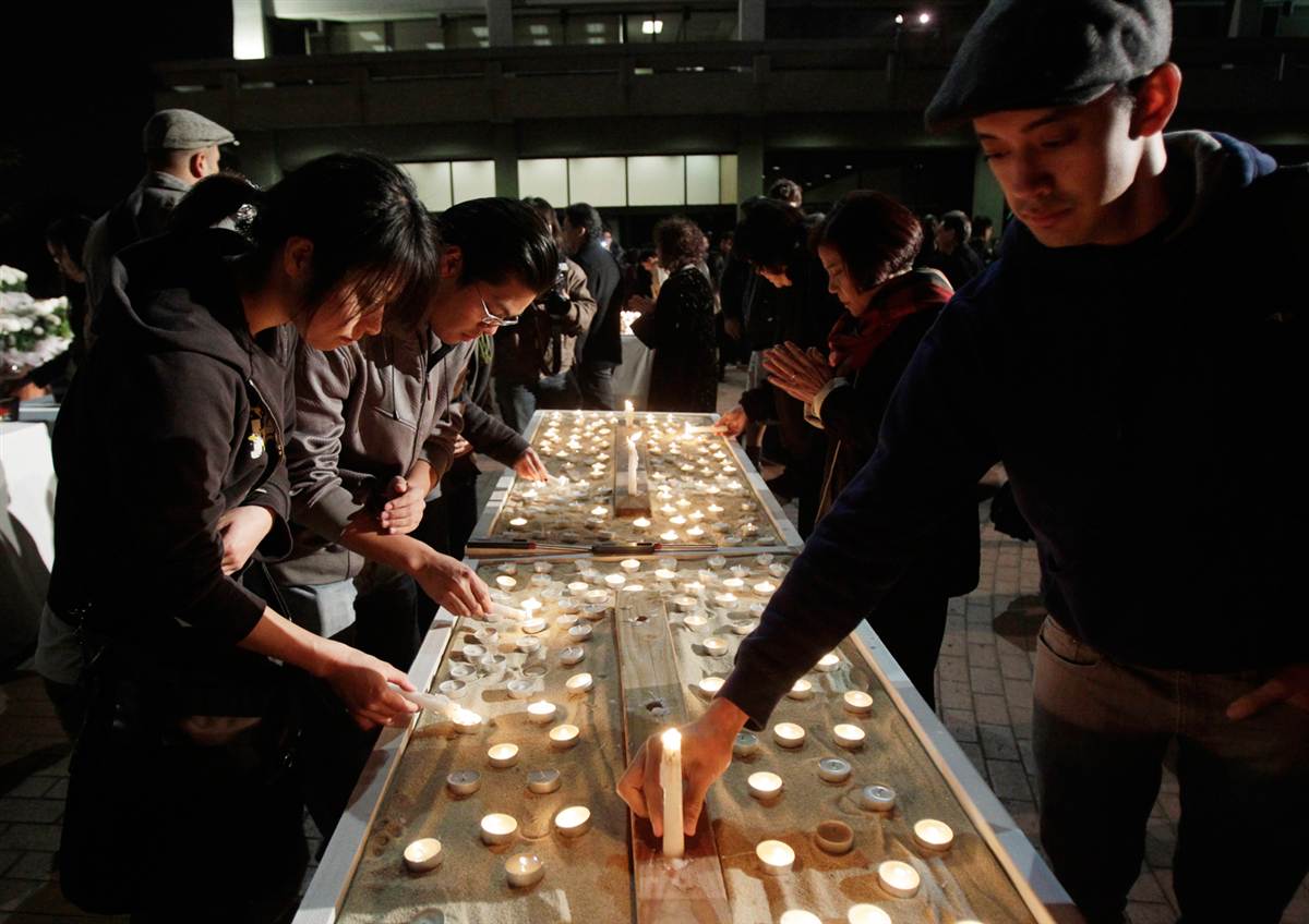 Personas rezando en un velatorio nocturno por las víctimas del terremoto y el tsunami de Japón el 17 de marzo.