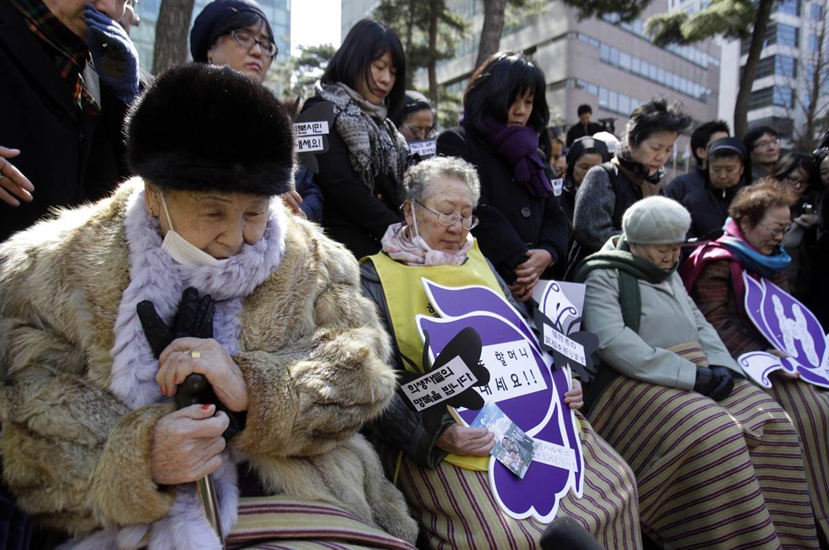 Mujeres mayores surcoreanas, las cuales sirvieron como esclavas sexuales para el Ejército Imperial Japonés durante la Segunda Guerra Mundial, ofrecen su silencio a las víctimas del terremoto y el tsunami ocurrido el viernes 11 de marzo en Japón, enfrente de la embajada japonesa en Seúl, el pasado miércoles 16 de marzo.