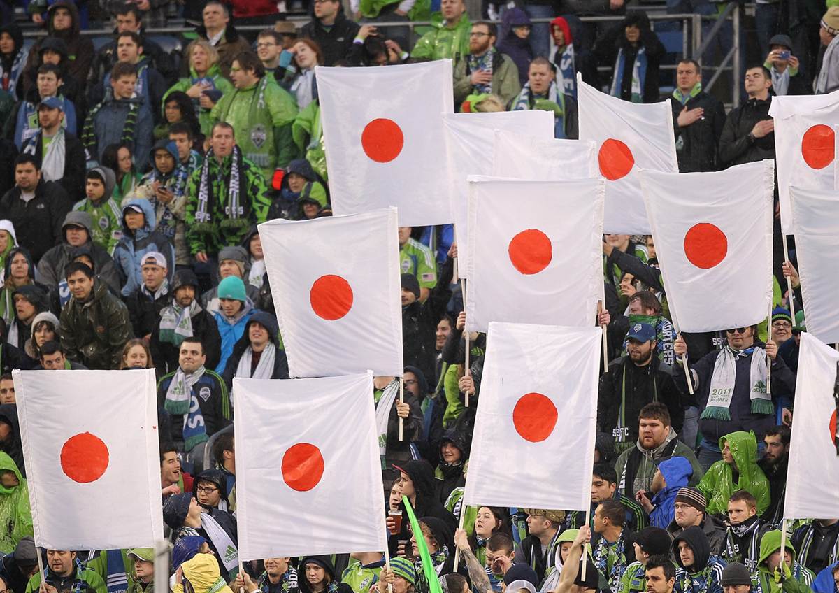 Aficionados del Club de Fútbol Seattle Sounders, sostienen unas pancartas en honor a las víctimas del reciente terremoto en Japón antes del juego contra Los Angeles Galaxy, en el estadio Qwest Field, el miércoles 15 de marzo en Seattle.