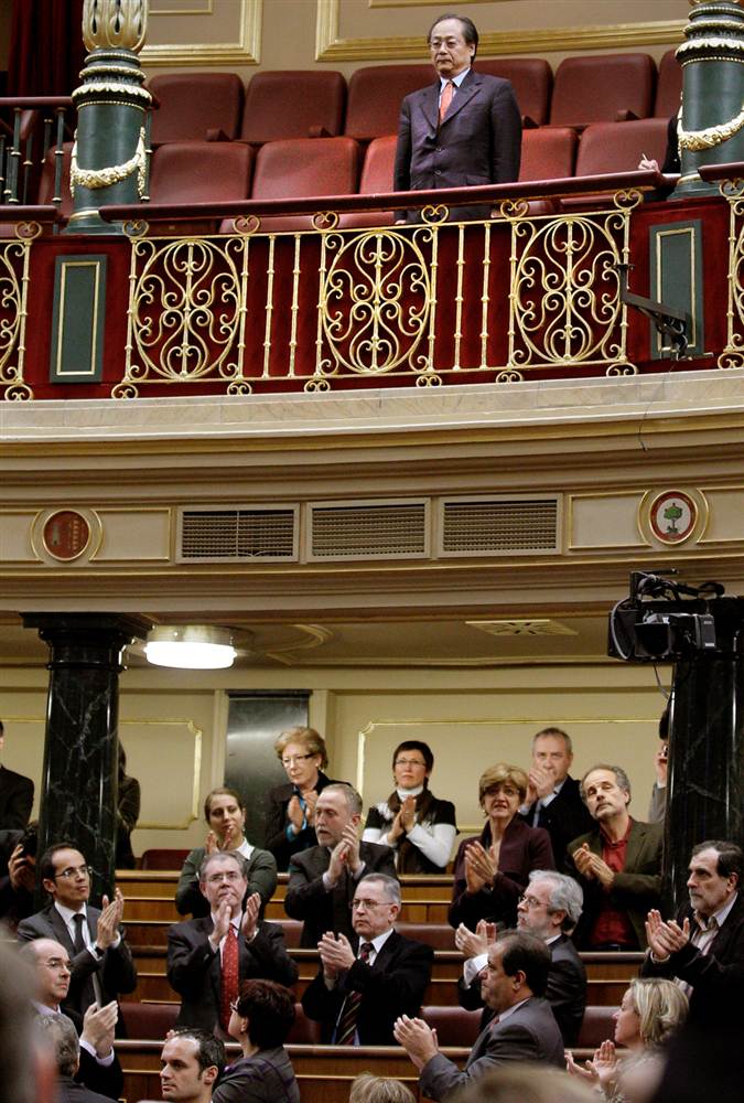 Miembros del parlamento español aplauden al embajador de Japón en España, Fumiaki Takahashi, en medio de una sesión el 15 de marzo en Madrid, en la que se aprobó una declaración oficial de ayuda y solidaridad con el país nipón.