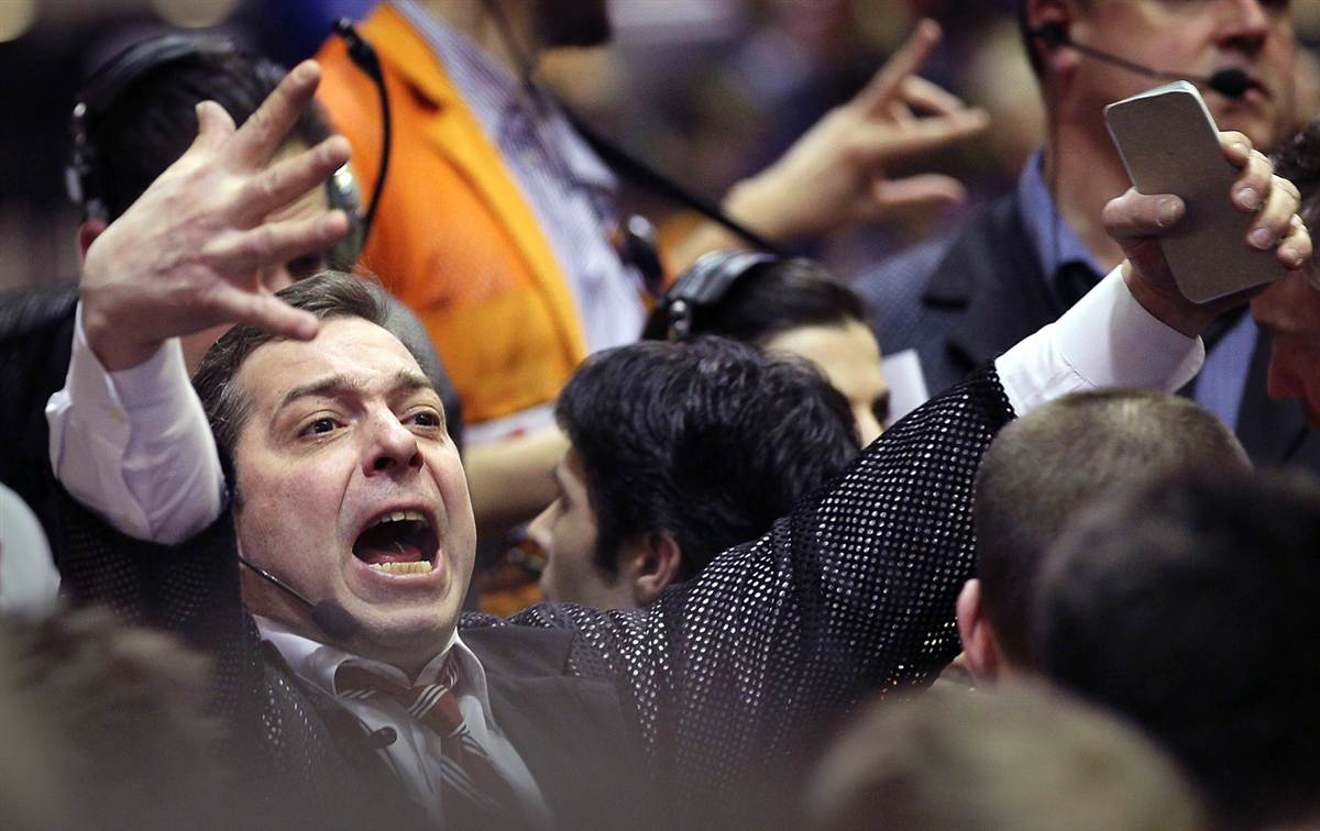 Un operador señala una oferta en el maíz del parqué de valores del Grupo CME el 15 de marzo en Chicago. Los precios de las acciones y las materias primas se desplomaron siguiendo un brusco descenso en el mercado de valores japonés, mientras los inversores del mundo se preocuparon por el impacto económico del reciente terremoto, tsunami y crisis nuclear.