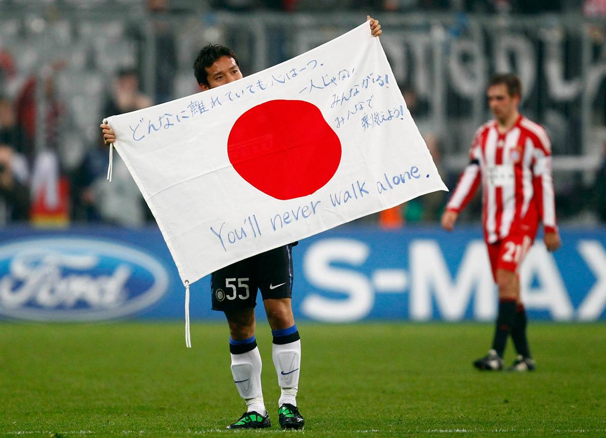 El jugador Yuto Nagatomo, del Inter de Milán, sostiene una bandera japonesa durante el partido contra el Bayern de Munich el 15 de marzo en Munich.