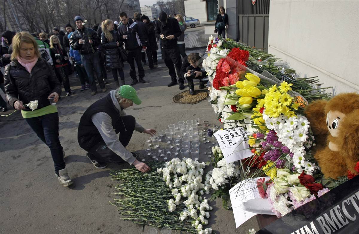 El lunes 14 de marzo, varias personas depositaron flores y velas frente la embajada de Japón en Moscú, Rusia, en memoria de las víctimas del terremoto.