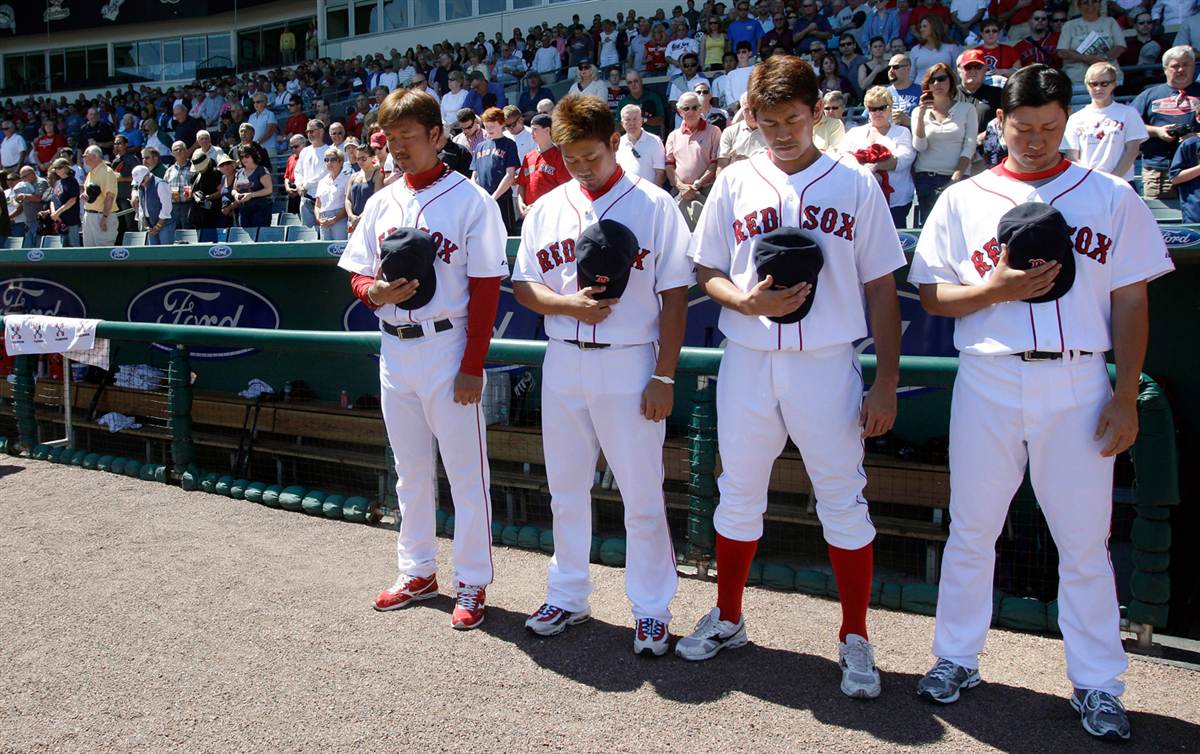 Los jugadores japoneses del equipo de béisbol Boston Red Sox realizan una pausa junto a los aficionados para un momento de silencio en honor de las víctimas del terremoto y tsunami en Japón, antes de enfrentarse a los Florida Marlins el pasado 12 de marzo. De izquierda a derecha: Hideki Okajima, Daisuke Matsuzaka, Itsuki Shoda y Junichi Tazawa.