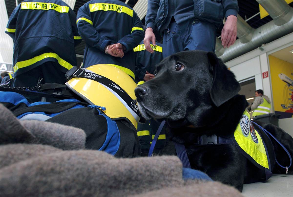 Un perro de búsqueda y rescate junto a miembros de la Agencia Federal Alemana de Auxilio Técnico (THW), esperan para tomar un vuelo a Japón en el aeropuerto de Frankfurt-Hahn cerca de Lautzenhausen, Alemania, el pasado 12 de marzo.
